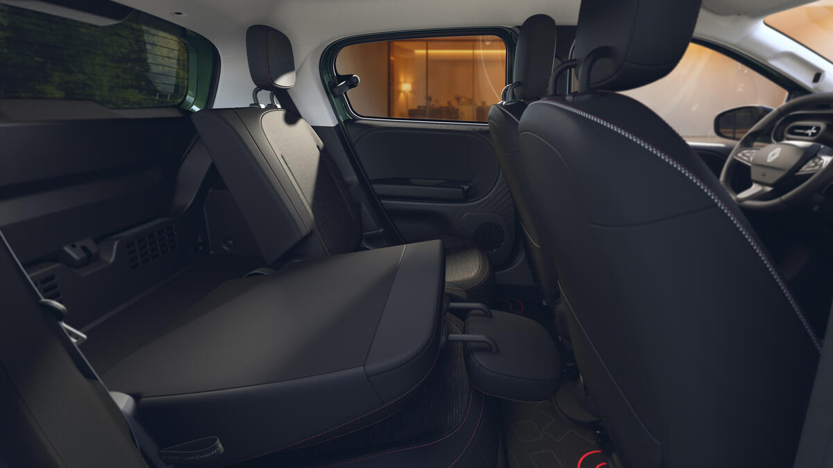 Bereits in der Version Evolution verfügt der vollelektrische neue Twingo über einzeln verschiebbare Rücksitze, ein 7-Zoll-Digital-Kombiinstrument, ein 10-Zoll OpenR link Infotainmentsystem mit Smartphone-Integration, einen höhenverstellbaren Fahrersitz, eine manuelle Klimaanlage und Parksensoren hinten.